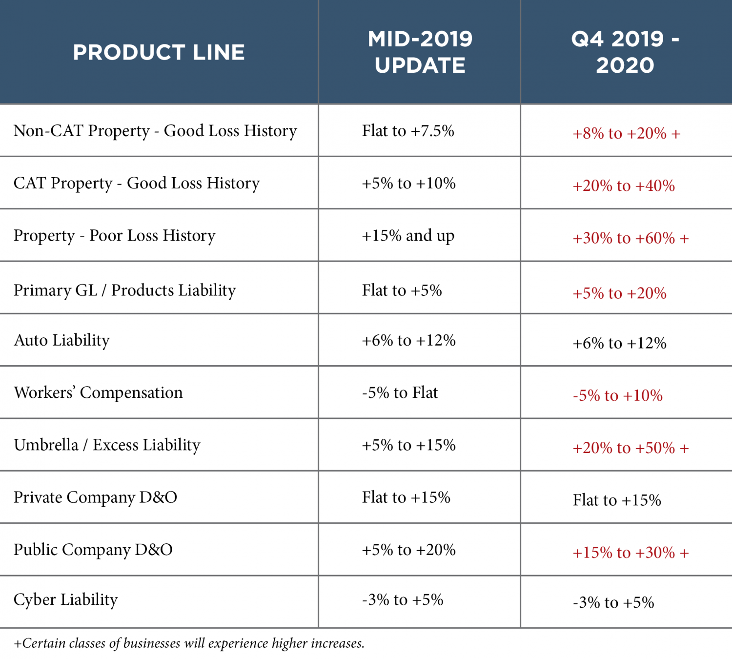 As we begin a new decade, we are navigating an increasingly unpredictable insurance market and many businesses are facing significant pricing increases upon renewal. Our 2019-2020 Property & Casualty Market Outlook, which was released in June 2019, provided our reaction to market trends and some pricing expectations.  With Q3 and Q4 now behind us, we thought it would be beneficial to share an update with new insights and observations to better prepare our clients for current pricing pressures and provide guidance for managing the net impact.